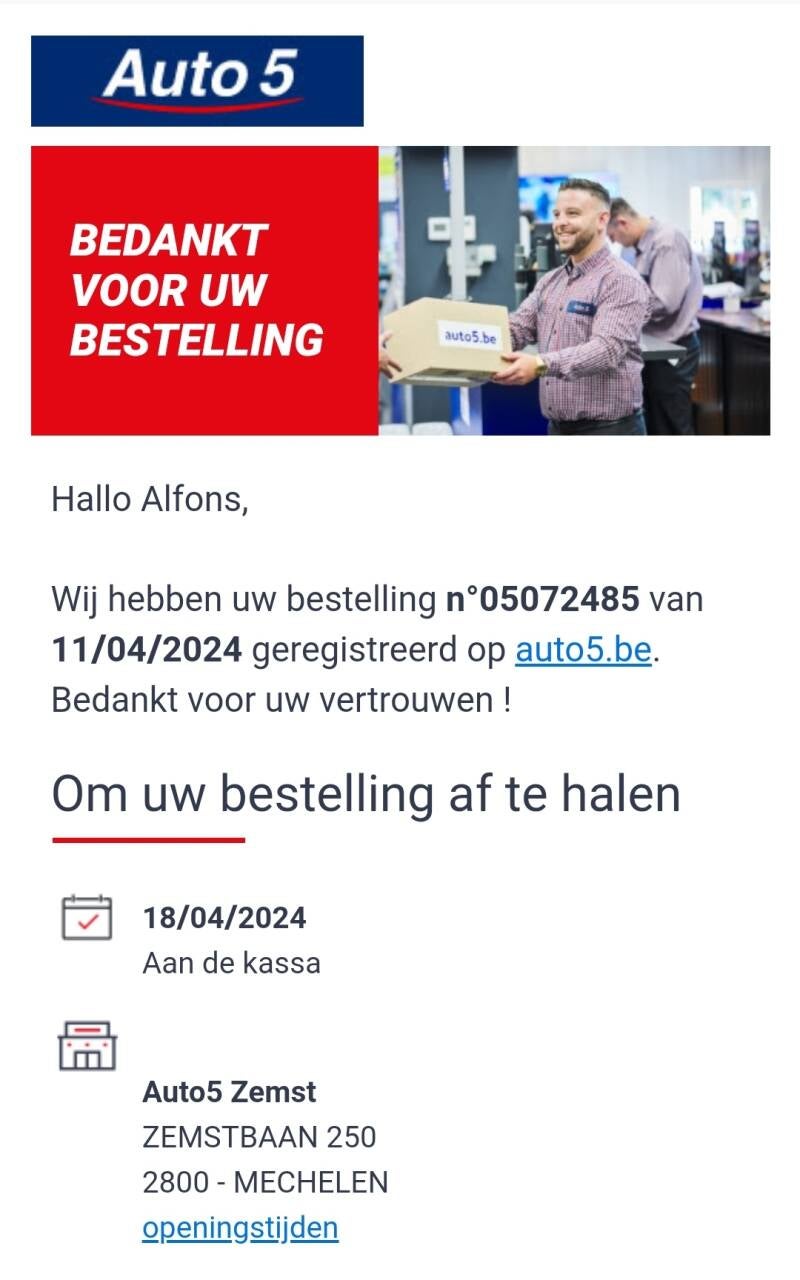 Auto5 was tot vandaag 18/04/2024 een auto/garage/winkel-bedrijf met goede reputatie. Helaas, vandaag was mijn bestelling van 11/04/2024 niet klaar op de afspraak. - 32 km heen en weer, verplaatsing, om niets.