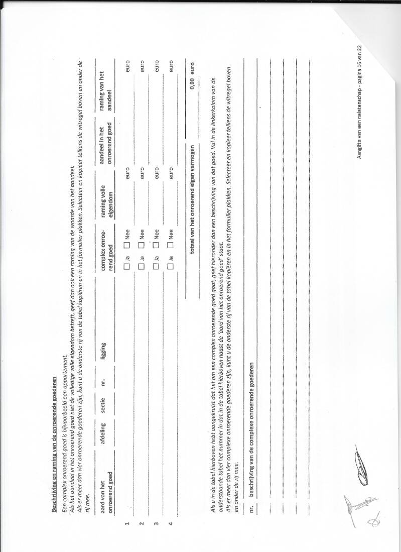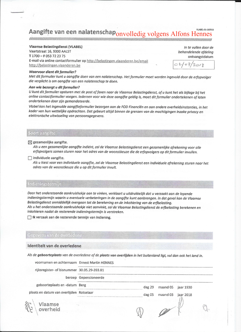 nr 700001 opmerkingen over de ondertekende aangifte van : nalatenschap vader Ernest HENNES