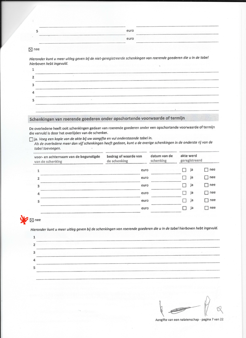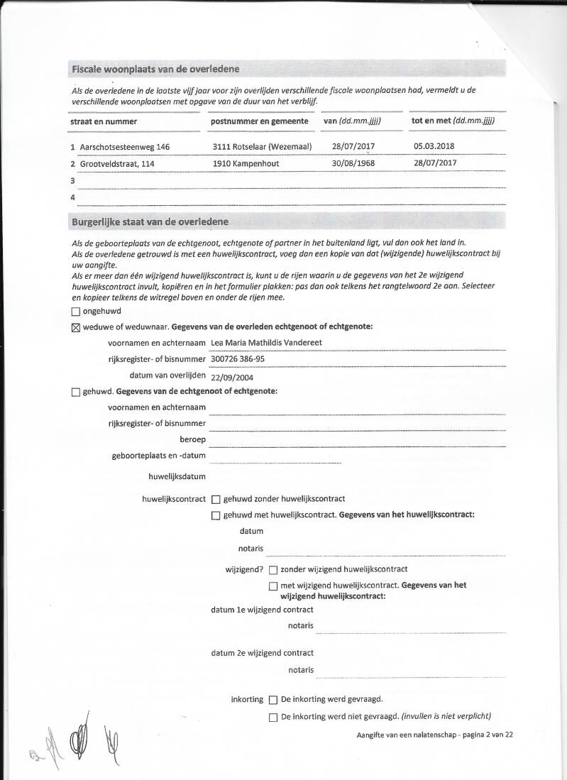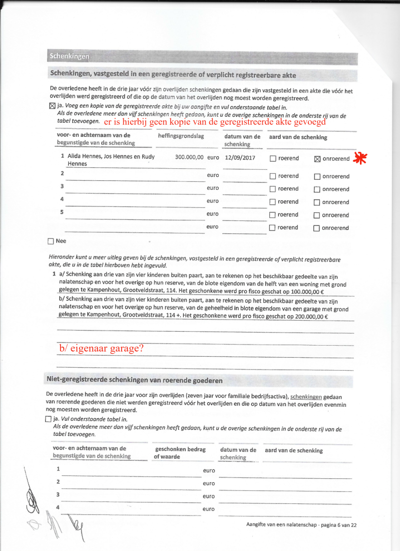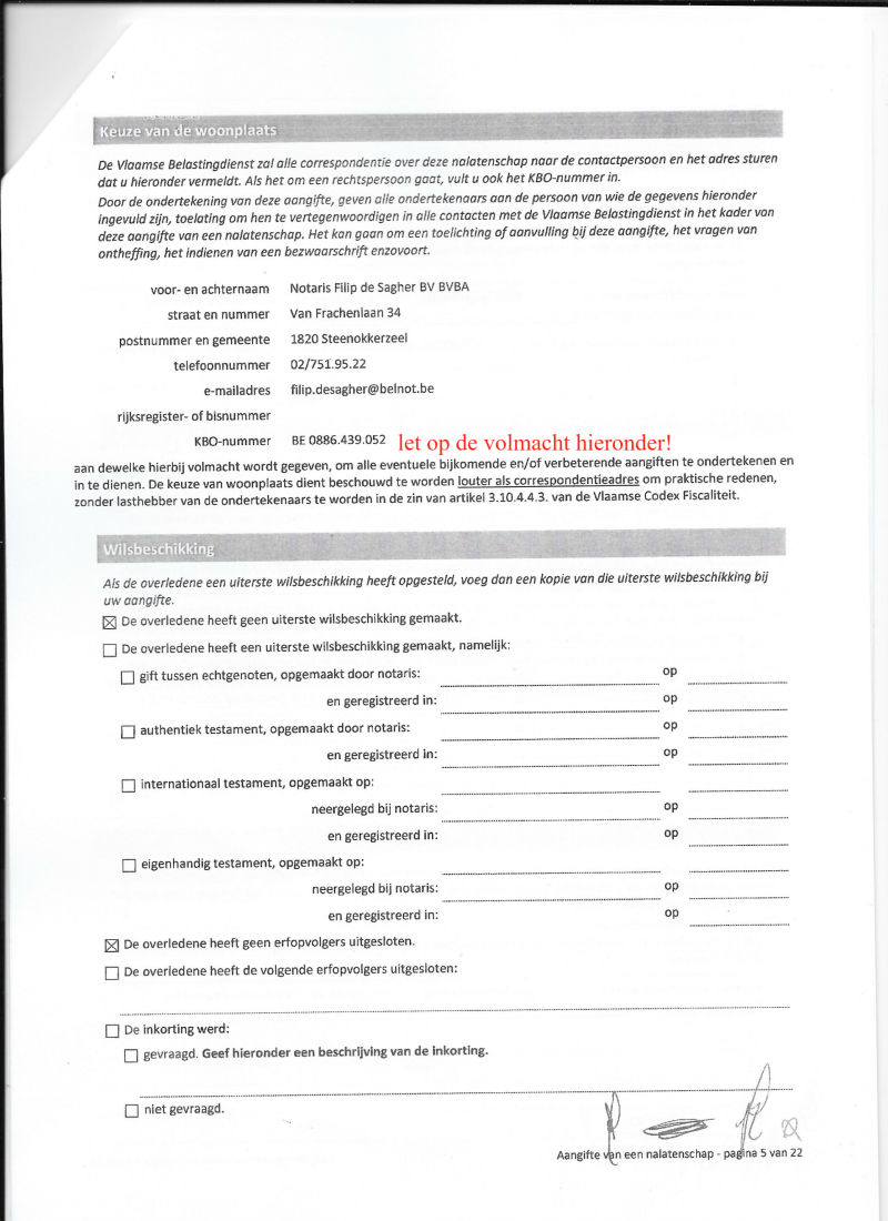 Ofschoon pagina 5 vermeld dat volmacht is gegeven aan notaris de Sagher om bijkomende en of verbeterende aangiften in te dienen : schrijft die notaris aangetekend : 13 juli 2020 terzake : wij verzoeken U vriendelijk U in de hangende dossiers tot uw notaris te willen richten ( terwijl notaris Meester Katrien Devijver helemaal géén volmacht heeft.